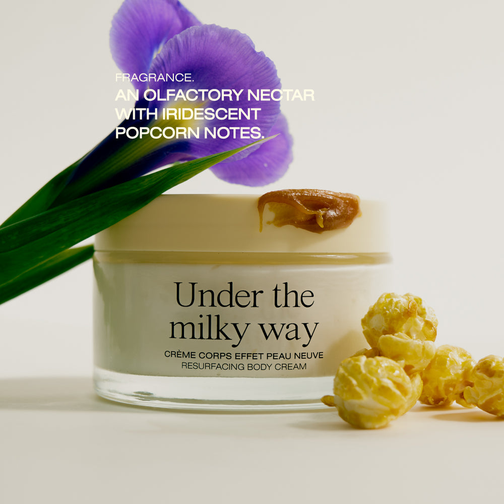 The body cream that enhances the skin: a cocktail of powerful active ingredients to smooth, hydrate and illuminate, infused with the fragrance Under the milky way — a sophisticated treat with notes of iris, popcorn and salted caramel, by perfumer Margaux Le Paih Guérin.